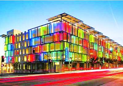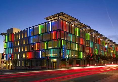 这座2.79万平方米的建筑物位于圣莫尼卡市中心,是美国第一座通过LEED认证的车库,这意味着它是节能和环保方面的一个成功典范。这座车库除了为传统汽车准备了900个停车位外,还为电动车预留了14个车位,并能存放自行车。该建筑设计由太阳能电池板提供能量,利用发光二极管照明,以可持续材料建成。