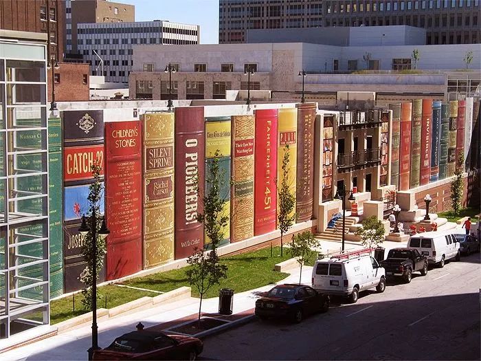 美国堪萨斯城公共图书馆的停车场就将书本放到了建筑台面,用22本古典文学撑起了一片天。停车场设计成独特的书架样式,全都是一些堪萨斯城居民推荐的图书,不仅体现了堪萨斯城居民对图书的热爱,还充分发挥了城市建设的创造性。22本古典文学的书脊被做成7.6米高,2.7米宽的大小,立于墙面,两本“书”之间夹着金属楼梯井,模仿书挡。一般来说,车库会被塞进建筑空间,或者挡在建筑后面。然而,这座车库是在前面的中间位置,带领读者进入图书馆。