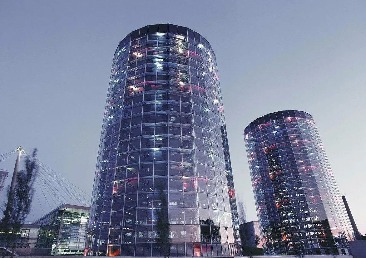 德国沃尔夫斯堡-大众停车楼由两个圆柱体塔库组成,名为“Car Tower”,是用来存放汽车的立体车库。塔库总高48米,直径23米,每层20个车位,每个塔20层,双塔一共可容纳800辆车。每个塔库配备了2个机械臂,各负责取放180度范围内的车位,借助于环绕中梁旋转的机械臂,新车以每秒2米的速度运到指定位置,从最高处取车时间最大为90秒。