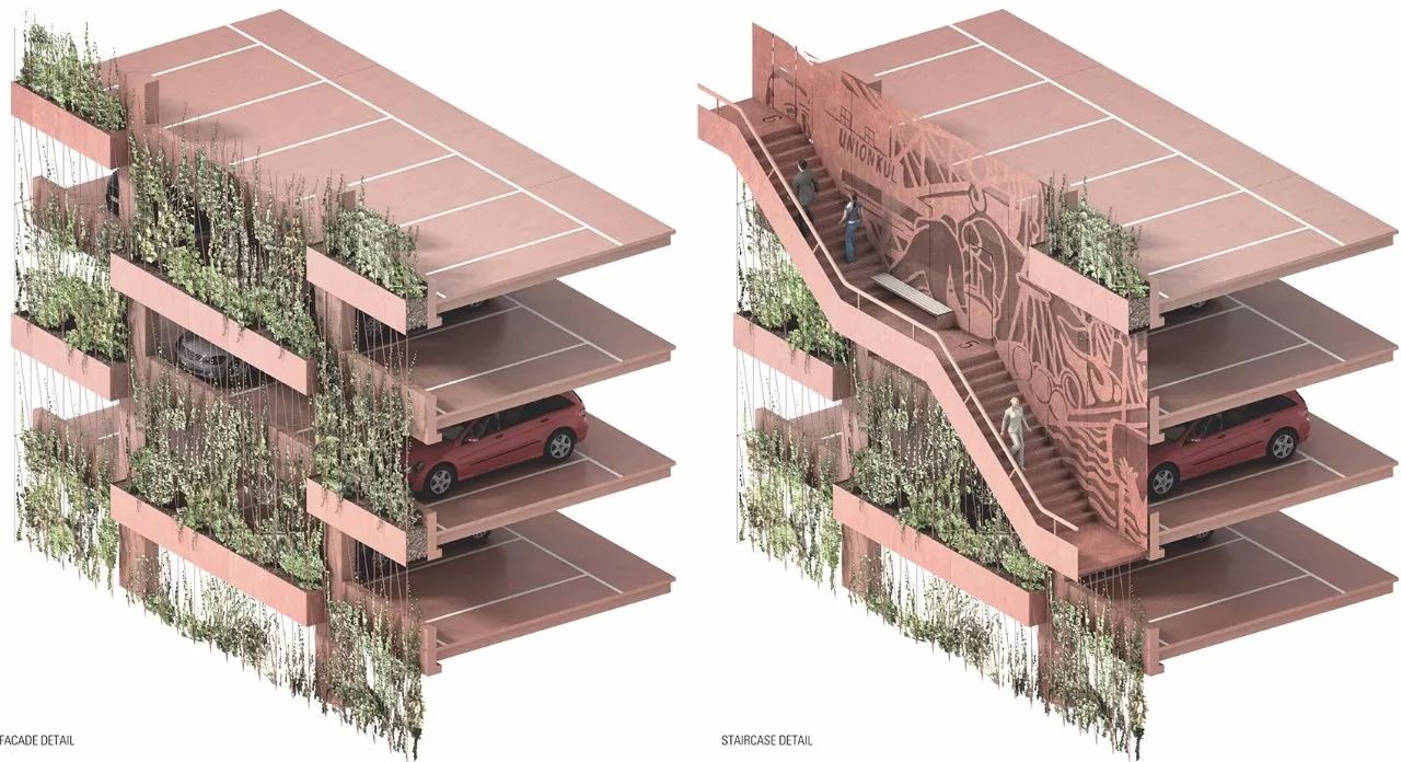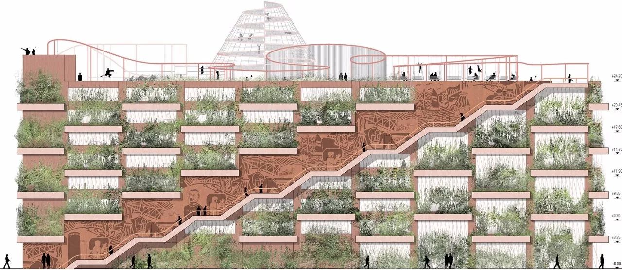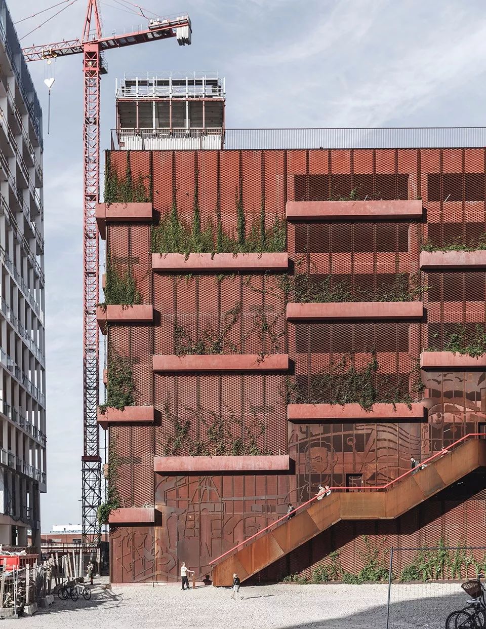 此停车场的设计并没有试图隐藏停车建筑的结构,而是希望以暴露的结构打破建筑立面的尺度,将其美丽展示在人们面前。一系列的种植槽外挂于立面之外,形成了与结构相呼应的节奏韵律,在创造宜人空间尺度的同时,将绿色带到了每一个角落。两条巨型楼梯穿插其中,其上的钢制扶手延绵而上,在屋顶转化为秋千、攀爬架、单杠等等面向各个年龄阶层的运动游乐设施,创造出一个活力十足的公共空间。从街道上看去,这道色彩亮丽的扶手仿佛邀请着人们拾阶而上,去尽享让人惊艳的屋顶景观、俯瞰壮观的哥本哈根港口全景。